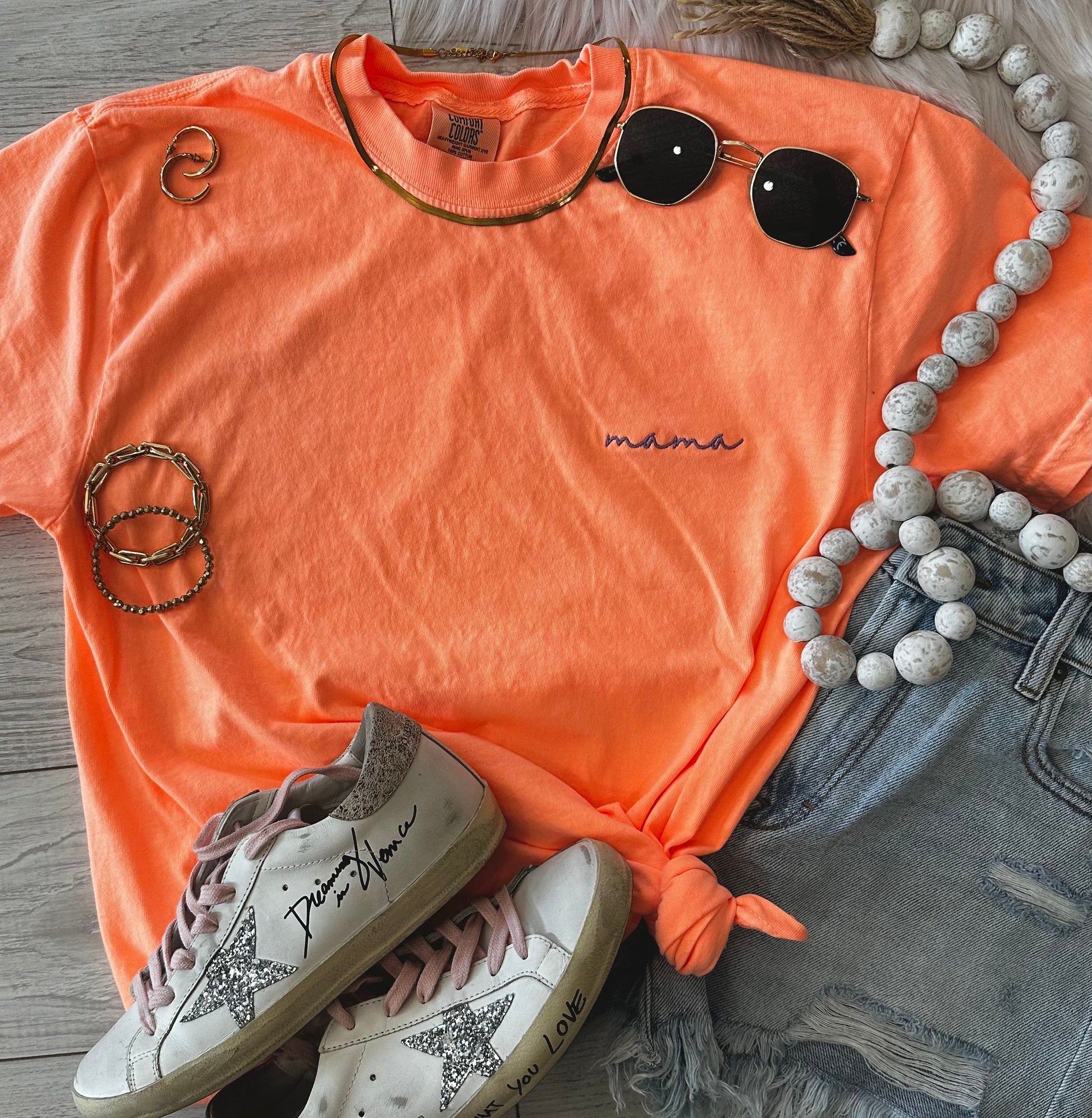 Neon Coral Dainty Mama Embroidered Tee